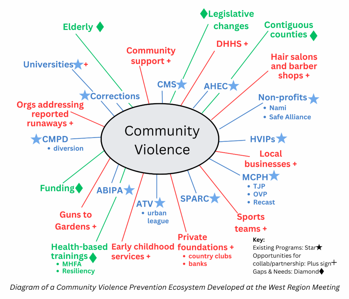 A highlight across all meetings was a hands-on breakout session where participants visually mapped their ideal violence prevention ecosystems. These diagrams serve